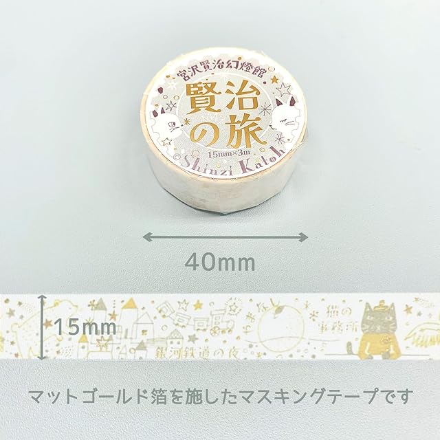 雑貨デザイナー×絵本作家Shinzi Katoh(シンジカトウ)が宮沢賢治の世界を描いた、レトロな雰囲気漂う箔押しマスキングテープです。原文の一節を引用した絵本のようなデザインで、マットゴールド箔が作品の世界観を繊細に美しく表現しています。
