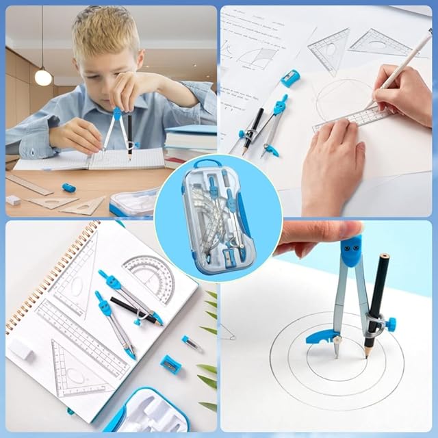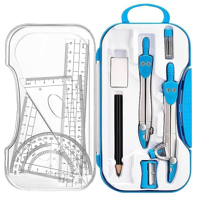 1.【幾何学セット】数学セット/幾何学セットには、コンパス×2、三角形×2、6インチ定規×1、3.5インチ分度器×1、コンパス用鉛筆×1、鉛筆削り×1、消しゴム×1、鉛筆芯リフィル×2が含まれています。 2.【収納しやすい】耐久性のあるプラスチックケースは、バックパックや机の中のツールを保護し、保存することができます。 3.【人間工学に基づいたデザイン】使用中に曲がることがなく、コンパスの頭は持ちやすいです。鉛筆や芯と一緒に使用することができ、コンパスの安全性と使い心地を大幅に向上させます。 4.【耐久性と頑丈さ】コンパスは金属製で、頑丈で実用的で、ねじれたり変形したりしにくいです。金属製の針先は磨耗しにくく、位置決めが正確でしっかりしており、製図効率を向上させることができます。 5.【幅広い用途】使いやすく、あらゆるレベルの学生、エンジニア、デザイナー、教師製図、製図学校やオフィスプロジェクトに適しています。また、家族や友人への贈り物にも最適です。