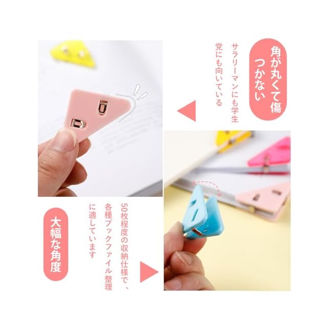 <p>【三角クリップ】三角クリップは90度の直角設計で、紙の巻き上がりをしっかり防ぐことができます。この三角形のクリップを使用すると、紙の端と角をよりよく保護し、紙を傷つけたり緩めたりすることなく、紙をしっかりと保持します。厚い資料や書籍は、ホッチキスでは固定や保管が難しい。三角クリップを使うと簡単に、しっかりと資料を整理することができます。</p><p><br></p><p><br></p><p>【高品質の素材】コナークリップは高品質なABS素材と金属で作られており、丈夫で耐久性がある、防水、防錆、軽量、耐摩耗性があり、壊れたり色あせたりしません、長期間使用でき。 使い方が簡単、滑り落ちたり脱落したりすることはありません。色の鮮やかさは、保存しているものを簡単に見つけることができます。</p><p><br></p><p><br></p><p>【商品のサイズ】長さ:5.2 cm、幅:3.9 cm、数量:20個セット。一度に最大50ページの用紙を挟むことができます。これは、簡単にアクセスできるブックマークマークとして使用でき、同時に本の角を保護します、書きやすく、読みやすくなります。紙を傷つけたり緩めたりすることなく、紙をしっかりと保持します。</p><p><br></p><p><br></p><p><br></p><p>【使いやすい】開閉が簡単で、押して使用できます。つまむだけで簡単に挟むことができます、繰り返し使用可能。端や角がなく、誤って手を傷つける心配がありません、安心して使える。サイズが小さく、場所をとらず、使用しないときは簡単に収納できます、勉強やオフィスに便利で整頓されています。</p><p><br></p><p><br></p><p>【幅広い用途】写真や、書類資料の整理、試験用紙、原稿、楽譜、領収書などの保存と一時保存が必要な紙タイプのファイルは。すぐに簡単に管理でき、紛失を防ぐことができます。また、食品、スナック、ポテトチップスの密封フォルダーとしても使用できます。ファイルをまとめるときなど、学校、家庭、オフィスでの使用に最適です。</p><p><br></p><p><br></p><p><br></p><p><br></p><p><br></p><p><br></p>