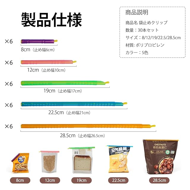 【大量30本入り&5種のサイズ】:8cm、12cm、19cm、22.5cm、28.5cmという五種のサイズがあります、各サイズ6枚ずつ、合計30枚クリップ入りいます。食べかけのスナック菓子の袋はもちろん、冷凍食品・ティーバック・乾麺・ペットフードなどの大きな袋も簡単にとめられます。