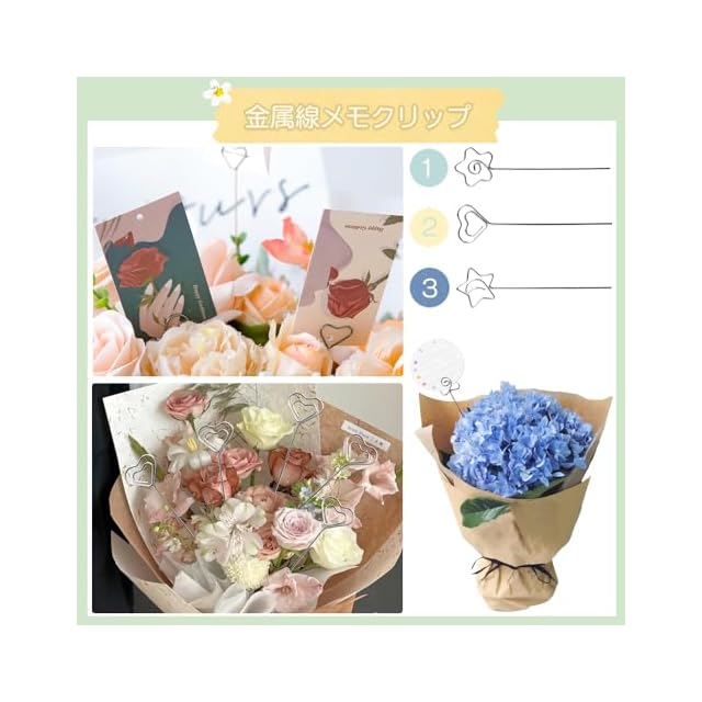 商品名:付箋クリップ クリップホルダー 写真クリップ 30本セット メモ クリップ 金属線メモクリップ 写真ホルダー メモスタンド 可愛い形 DIY愛好家に最適 結婚式 記念日 ホーム装飾用 店舗用 長さ130mm(3種類 ハート型/星型/花型各10個)