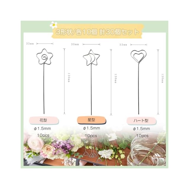 セット内容:クリップホルダー30本セット (形:ハート型、星型、花型各10個 計30個);サイズ:長い130mm(ご購入前に、サイズを確認してください)実用性と装飾性を兼ね備え、シンプルでスタイリッシュで、美しい装飾品です。