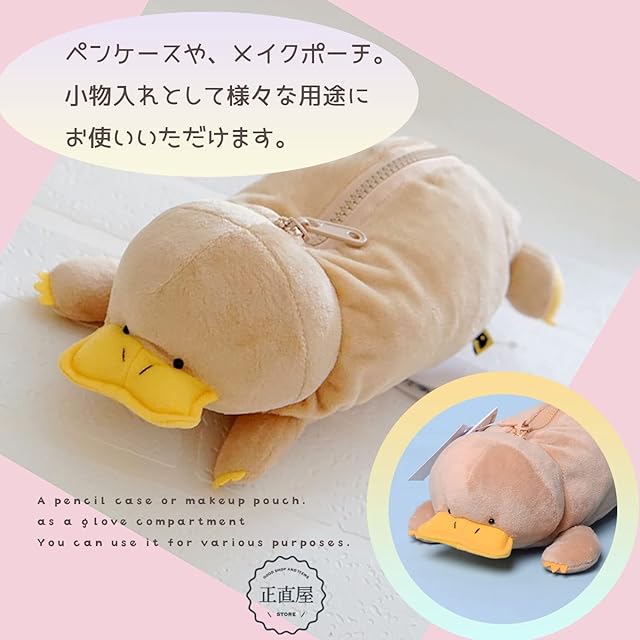 ゆるふわ動物ペンケースです。かわいいカモノハシ。筆箱だけでなく化粧ポーチや小物入れとしてもご利用できます。 <br> 身近な小物をいろいろ収納。ふわふわモコモコのカモノハシを身近においてください。 <br> プレゼントにも最適。実用性も十分ですが、ぬいぐるみとして可愛いです。 <br> 化粧品やコスメ収納としても最適です。コンパクトなサイズですのでどこでも持ち運びに便利です。 <br> サイズ等は画像を参照してください。