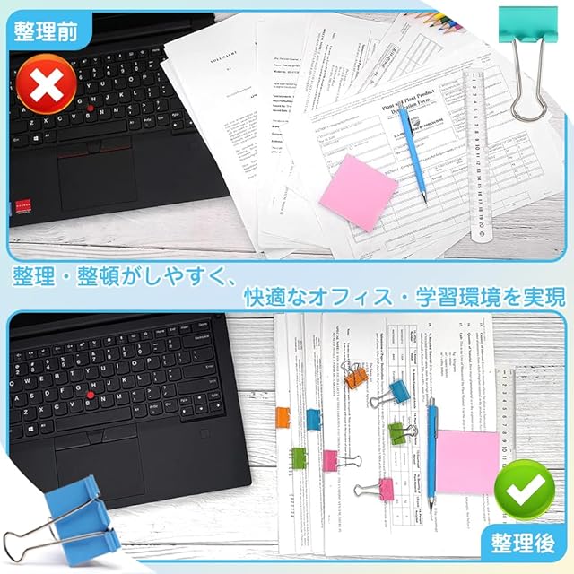 商品名:ダブルクリップ ペーパークリップ バインダークリップ 万能クリップ しっかり挟める フォールドバッククリップ クリップペーパー 48個入り 19mm 金属製 事務用品 書類整理 文房具 (4色)