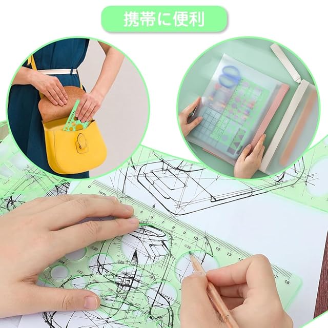 仕様:円形、六角形、楕円形、三角形など、さまざまな幾何学模様がある定規を4つ受け取ります。色は緑(透明)です。