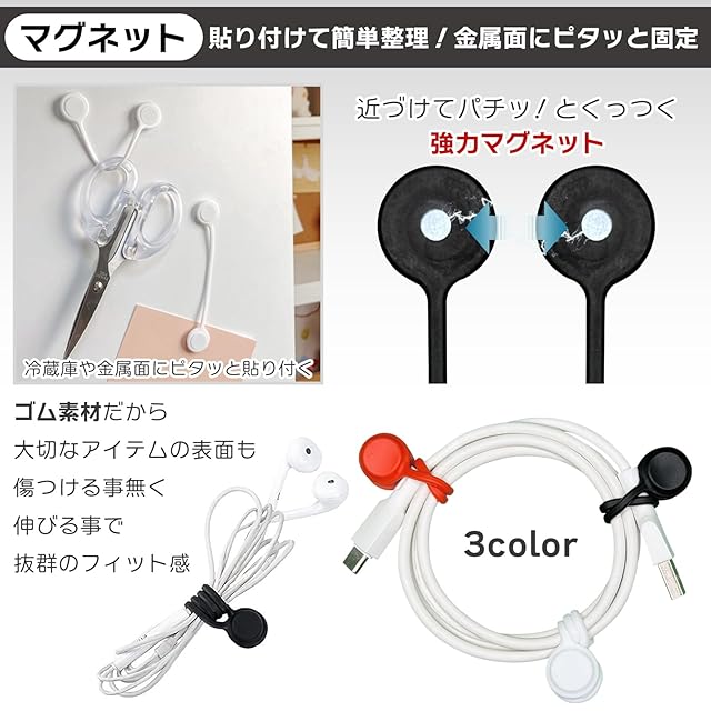 【3種類のバンドが試せるお試しセット】シリコン・マグネット・マジックテープの3種類をセットに。用途に合わせて選べるので、最適なケーブル整理方法を見つけられます。
