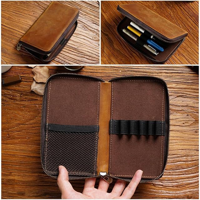 HIMHERCOM ペンケース 筆箱 レザー ファスナー筆箱 固定バント付き 小物入れ 大容量 メンズ レディース 万年筆 ペン 保護 レトロ ケース 万年筆箱 本革 筆箱 高校生 ペンオーガナイザー 男女兼用 (色 : Brown)