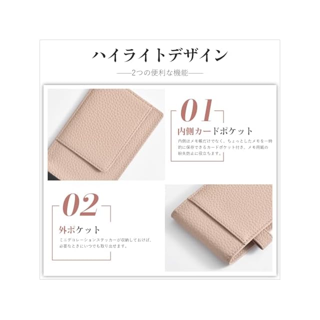 収納機能抜群:内側のカードポケットには、名刺やチケットなどを一時的に収納できます。また、外側にはミニ飾り付箋シールなどを収納できるポケットがあり、必要な時にすぐに取り出せます。日常生活に不便を感じさせない、ちょうどいい収納力です。