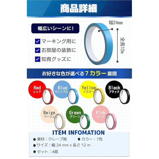 fogman マスキングテープ カラフル 幅広 マステ 紙テープ 幅24mm 長さ12m (イエロー)