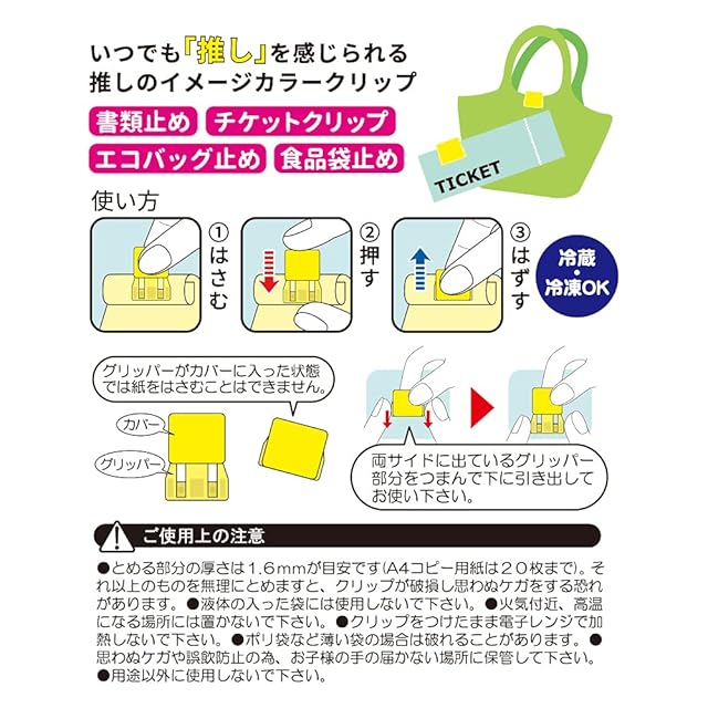 書類止め、チケット整理、エコバッグ止め、食品袋止めなど いろいろな用途に使えるクリップです