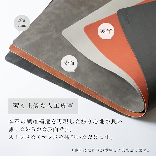 マウスも使える上質なデスクマット:本革の繊維構造を再現した上質な人工皮革を採用、触りごこちもよく滑らかな表面でデスク上を広い範囲で保護します。裁断面は、塗料などで保護するコバ塗り加工が施されているため、断面がほつれにくく長く快適にお使いいただけます。
