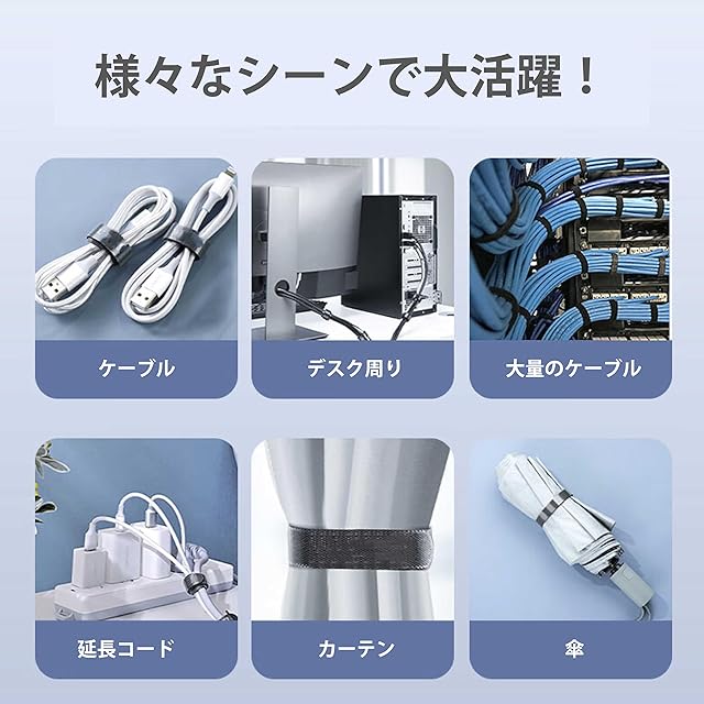 【配線を美しくまとめる多用途デザイン】パソコンや家電製品のコード整理、ケーブルまとめ、デスク周りの配線整理をはじめ、イヤホン、文房具の整理、ガーデニング、DIY、ヨガマットの束ね、布団止め、荷物まとめや植物固定、アウトドア用品小物の整理など、多岐にわたる用途で活躍します。ケーブルや配線が絡まるのを防ぎ、見た目も美しく整えます。
