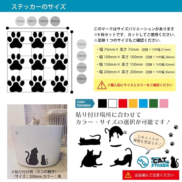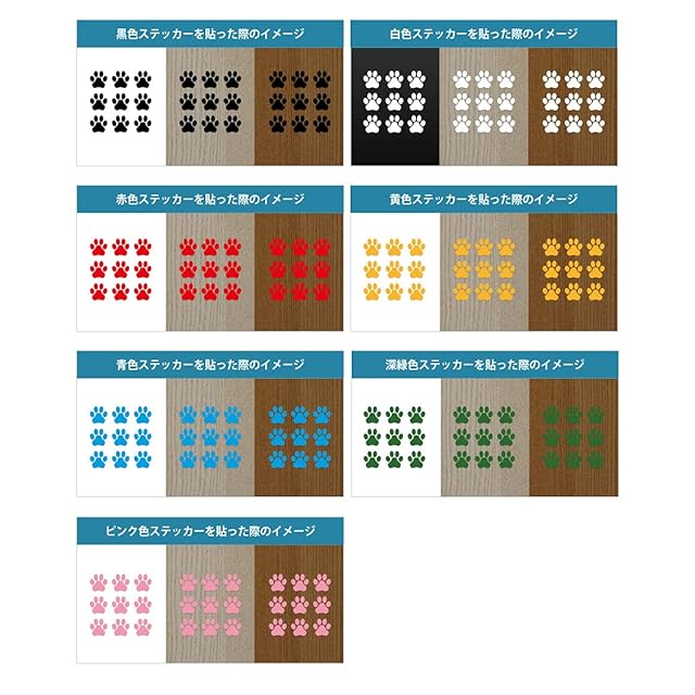 【商品詳細】カラー:全7色 / サイズ:幅75×高さ75mm(足跡1つの幅21mm)・幅100×高さ100mm(足跡1つの幅28mm)・幅150×高さ150mm(足跡1つの幅42mm)・幅200×高さ200mm(足跡1つの幅56mm) / ※サンプルのサイズ・カラーは選択不可となります。※「貼れる素材」を必ずご確認下さい。【セット内容(3点)】肉球 ステッカー,お試し用サンプルステッカー,貼り方説明書