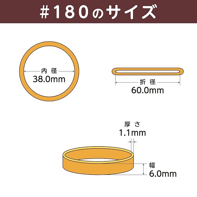 輪ゴムのサイズ : #180 ( 180号 ) 内径38mm / 折径60mm / 切幅6mm / 厚さ1.1mm