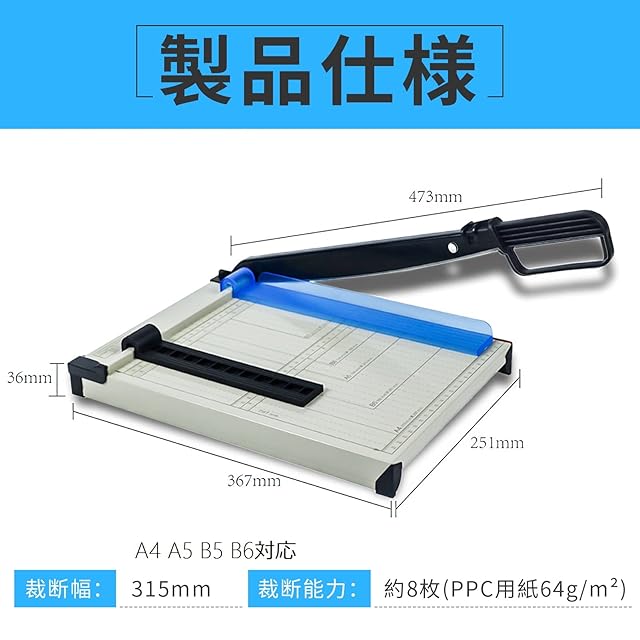 【裁断幅】315mm(A4長辺)【裁断能力】8枚(PPC用紙64g/㎡)【重さ】1.3kg