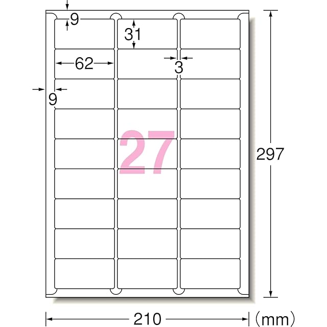 A4 27面 四辺余白付 角丸/シートサイズ:A4判(210mm×297mm)/ラベルサイズ:62mm×31mm(3列×9段)