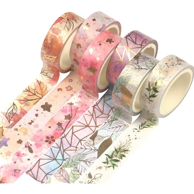 Yubbaex 花柄マスキングテープ 金箔押し 15mm幅 x 6巻 薄いです プレゼント包装、DIY工芸品、ノートの装飾に使える (ゴールデンフラワー)