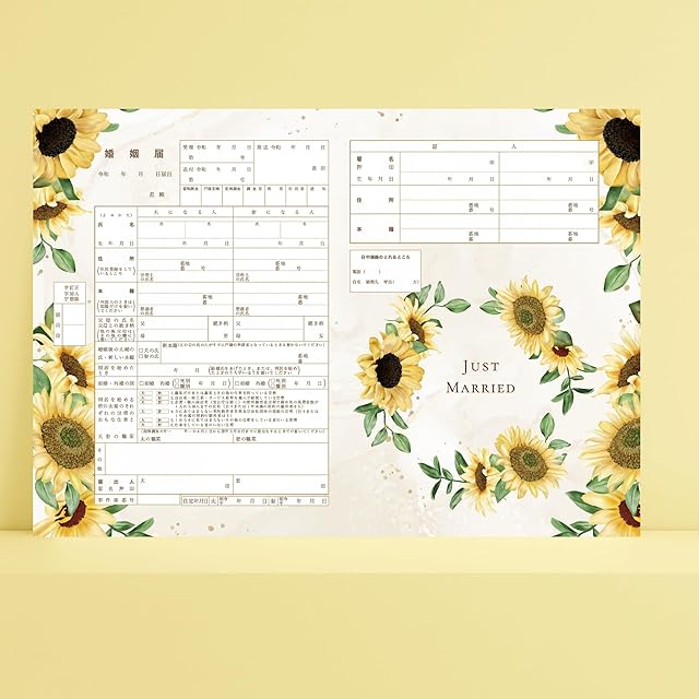 <高級上質紙3枚セット>役所提出用 婚姻届 ひまわり 向日葵 黄色 夏 花柄 購入いただいた方全員にクリアファイルプレゼント!! フラワー 花輪 可愛いオシャレ柄