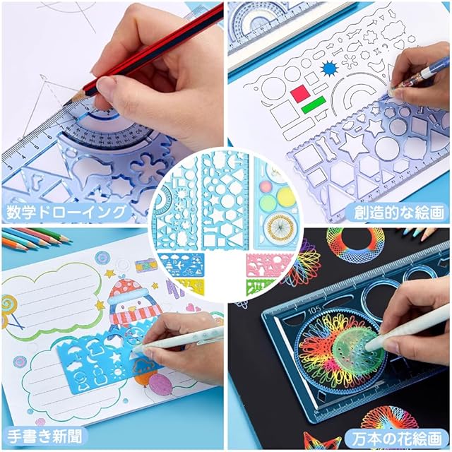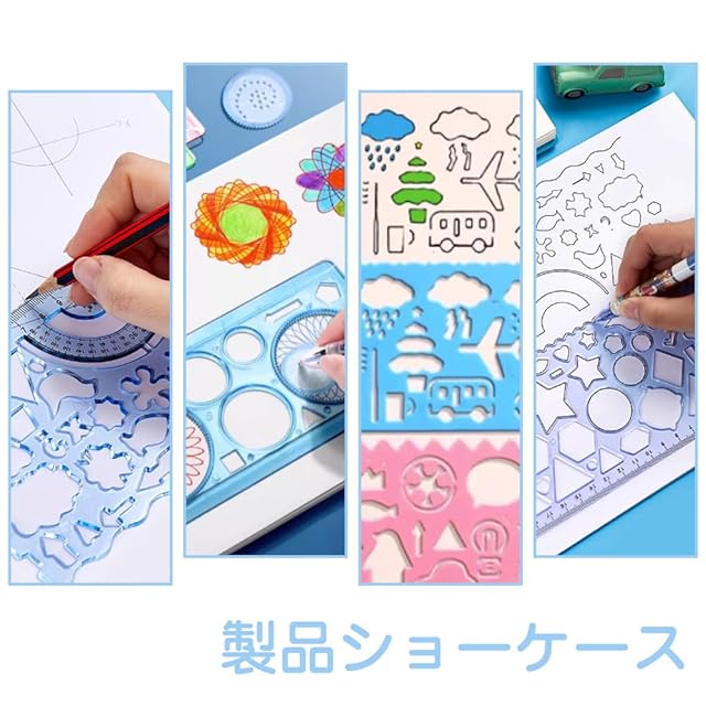 【多目的セット】異なる形や大きさの定規を含む7点セットで、小学生のお絵かき時の様々なニーズに応えます