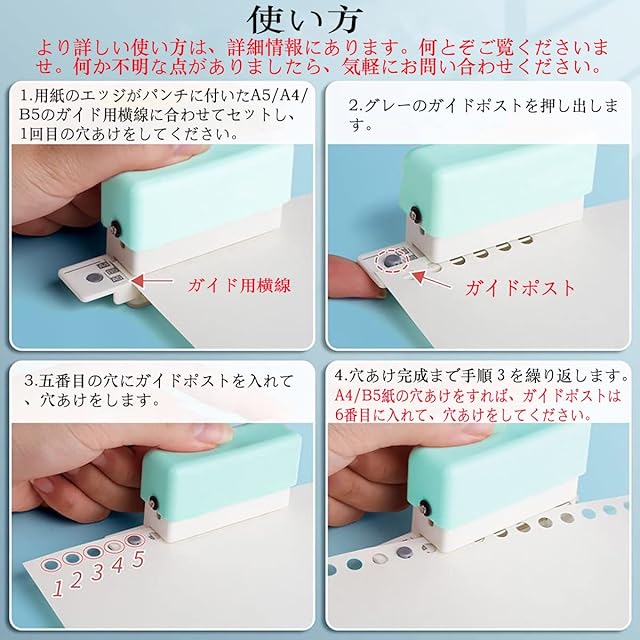 【用紙ガイド付き】A4・A5・B5用紙のガイド付きで、紙から簡単にルーズリーフが作れます。用紙の規格に合わせて設置したら、穴の位置を迷わずに決められます。穴を開け間違えて紙を無駄にする心配はありません, 紙を穴あけするのはより簡単になります。作業効率もアップします。パッケージにも取扱説明書が入っているので、ルーズリーフパンチの使い方を簡単に理解できます。