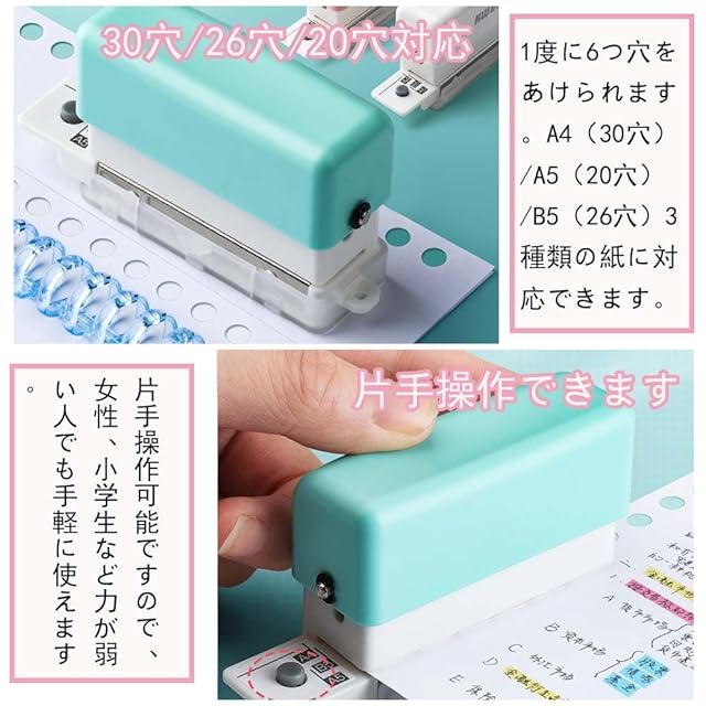 【A4/B5/A5ペーパーに対応可能】A4(30穴)/A5(20穴)/B5(26穴)3種類の紙に同時に対応できる穴あけパンチが新登場。使いやすくて、学生でも手軽に使えます。1度に6つ穴をあけられますので、使い楽々。コピー用紙やお気に入りのペーパーを、簡単にルーズリーフ仕様にできます。書類の整理に最適です。片手操作可能ですので、女性、小学生など力が弱い人でも手軽に使えます。