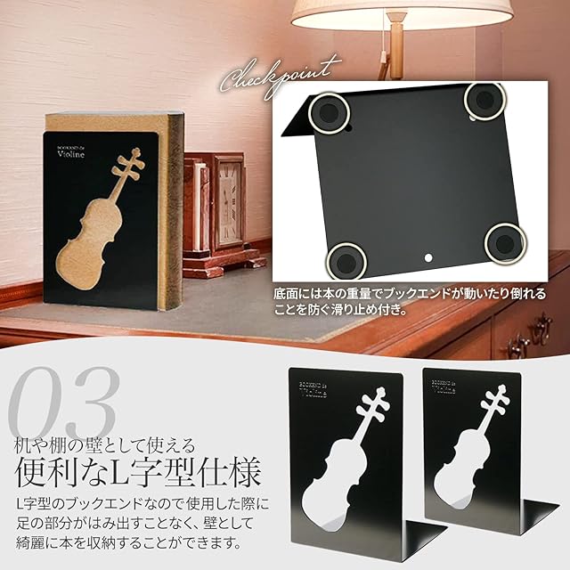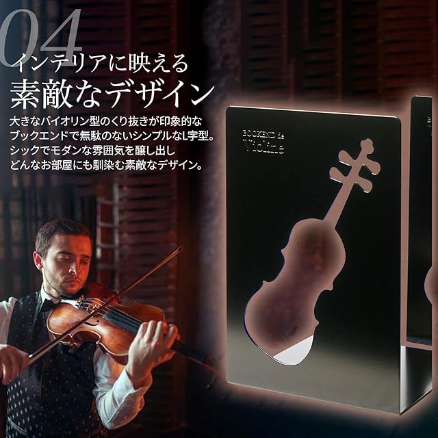 このサイズでは1.6mmの板厚があり安定感があります。バイオリンの絵柄。色は半艶の黒色塗装で、 落ち着いた感じに仕上がっています。本棚やデスクを傷つけない底部すべり止め付。 ブックエンドとして、お部屋のインテリアとしてもご利用いただけます。 サイズは小なので、B5サイズの書籍等が最適です。製品底部の3ヶ所の丸い穴は、製作上必要なのでご了承ください。 (使用上のご注意) 小さなお子様の手の届かない場所でご使用ください。 商標登録済