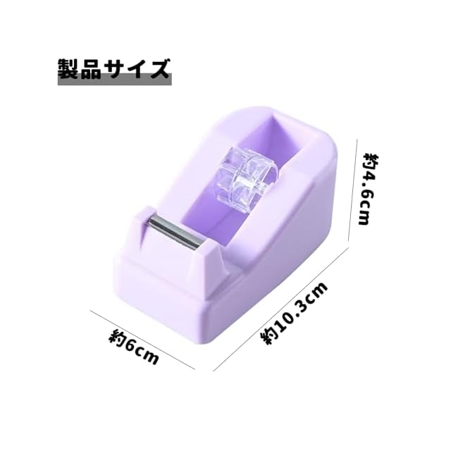 【商品仕様】ミニテープディスペンサー(パープル)*1。サイズは約10.5x6x4.5cmです。注:サイズは手動で測定され、写真はモニターや撮影時の照明の問題により若干の誤差が生じる場合がありますので、実際の商品をご参照ください。