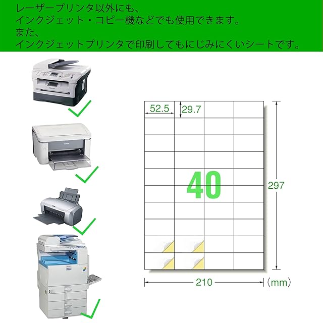 4.対応機種:インクジェットプリンタ、レーザープリンタ、コピー機でも印刷できるマルチタイプのラベルです。