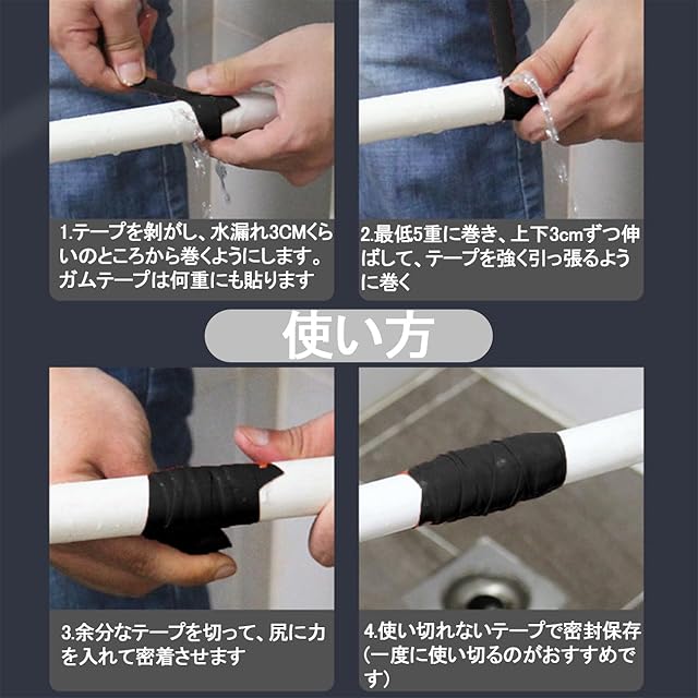【優れた防水力】このシーラントテープは撥水加工が施されており、防水性に優れています。水を遮断し、多くの水漏れを防止できます。防水性と強力な接着剤を活かし、水道管やキッチンの修理、パイプラインやPVCパイプの封鎖や漏れ対策に使用できます。浴槽やバスタブの亀裂、ホースやパイプ、排水管の漏れ、雨漏りの補修に最適です。