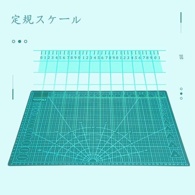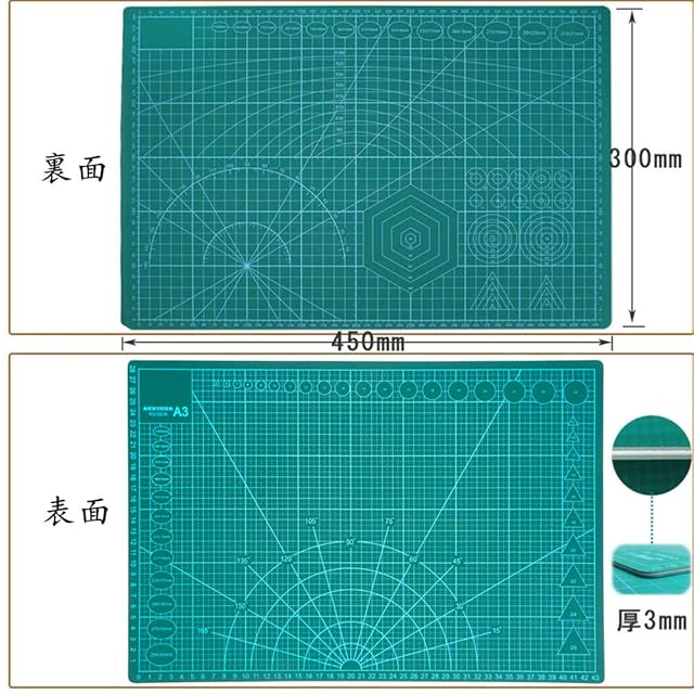 【使用】A3カッターマットが両面印刷、使用できます、表面に方眼状にラインが印刷されており、用紙サイズ表示もされていて、作業安くなります。カッティングマットの色がグリーンで、目にやさしくします。