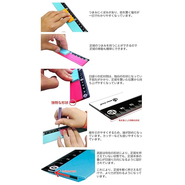 持ち上げやすい形状: 特殊な形状により、定規を容易に持ち上げることができます。