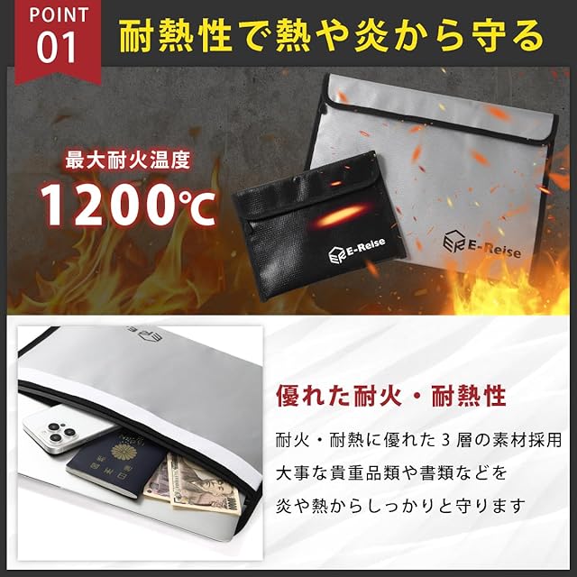 1.耐熱性で熱や炎から守る 耐火・耐熱に優れた3層の素材採用。 大事な貴重品や書類などを炎や熱からしっかりと守ります。 最大耐火温度1200℃。