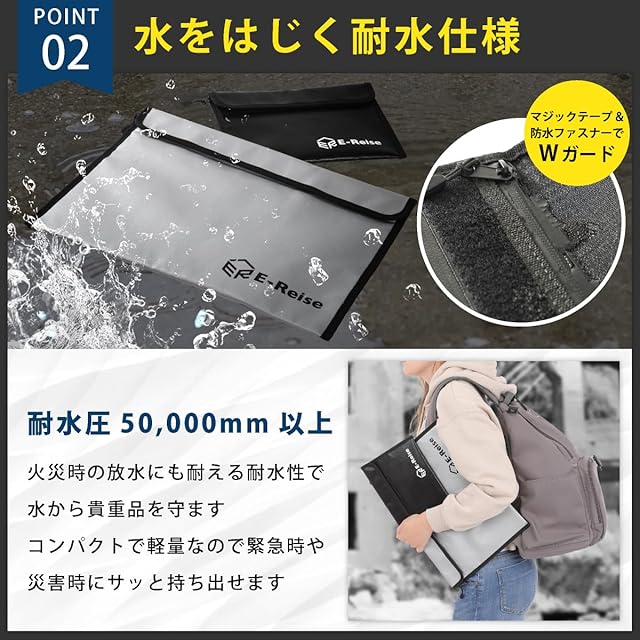 2.水をはじく耐水仕様 耐水圧50,000mm以上。 災害時の放水にも耐える耐水性で水から貴重品を守ります。 コンパクトで軽量なので、緊急時や災害時に素早く持ち出せます。