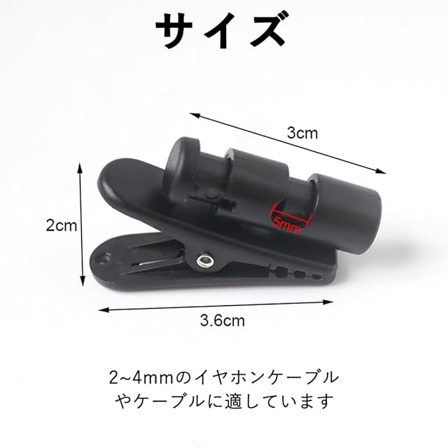ケーブルクリップ 5個セット、カラー:ブラック。2~4 mmのイヤホンケーブルやケーブルに適しています。