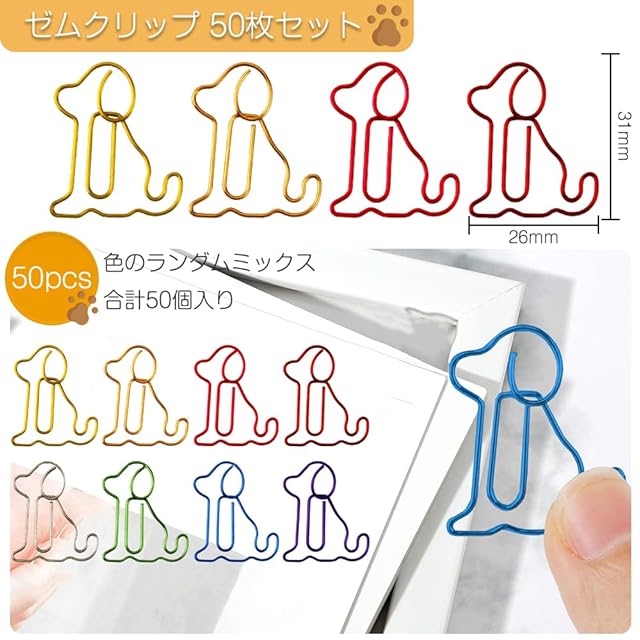 商品名:クリップ ペーパークリップ 50枚セット かわいい 犬 動物型 ブックマーク ファンクリップ ゼムクリップ 金属製 整理整頓が簡単 事務用品 写真 文書分類 書類整理用 子供用 学生用 素敵な贈り物 収納ボックス付き(色のランダムミックス)