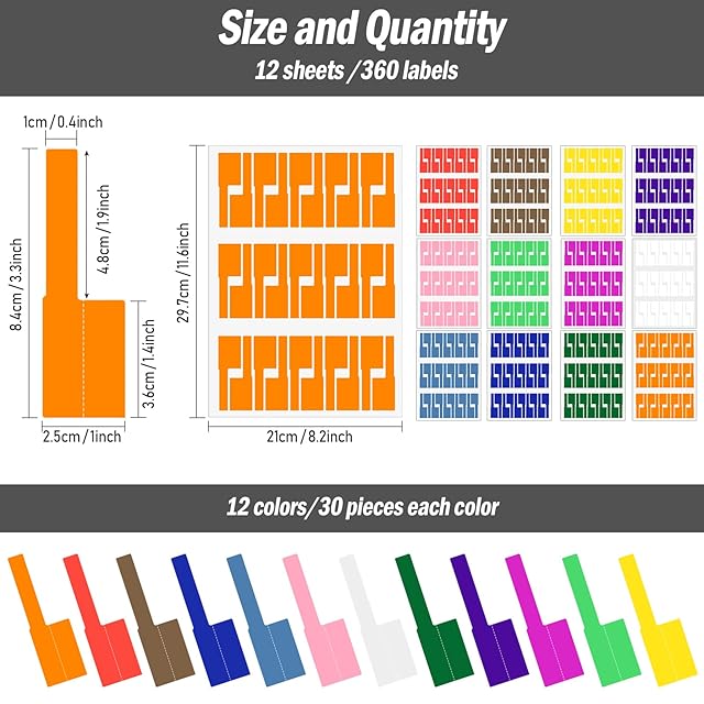 ケーブルタグサイズ:84mm×25mm <br> シートサイズ:A4 - 297mm×210mm <br> 数量:360枚 (色ごとに30ラベル) <br> カラー:12色