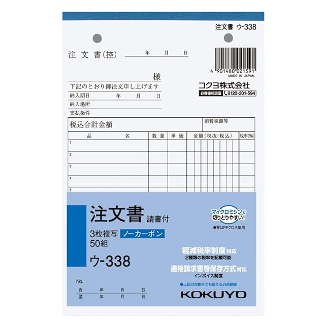 商品名:コクヨ(KOKUYO) 3枚注文書 請書付き ノーカーボン B6 タテ 8行 50組 ウ-338