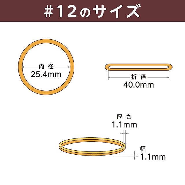 輪ゴムのサイズ : #12 ( 12号 ) 内径25.4mm / 折径40mm / 切幅1.1mm / 厚さ1.1mm