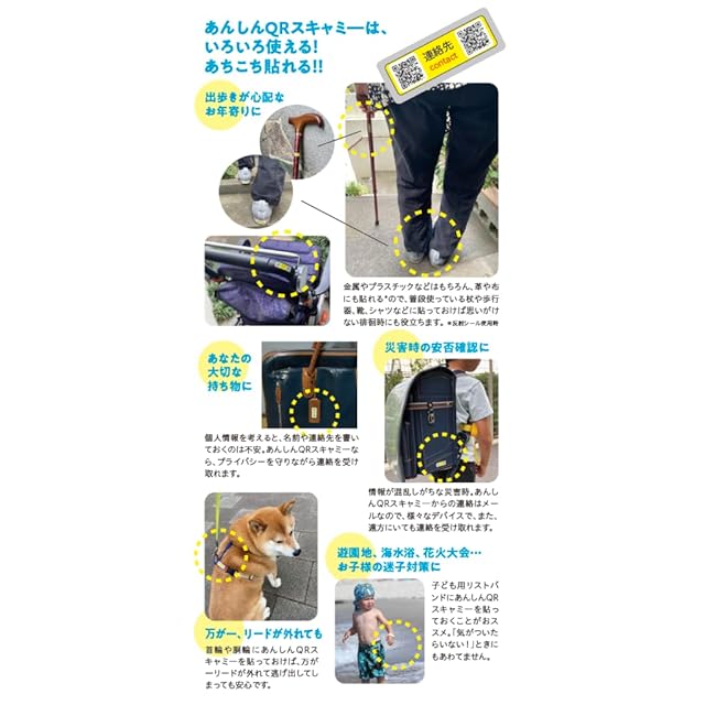 「あんしんQRスキャミ」は認知症の方のひとり歩きや、お子様の迷子対策に最適なQRコードシールです。衣類や靴、持ち物に貼るだけで、万が一の際に発見者がスマートフォンでQRコードをスキャンすることで、保護者へ匿名で発見連絡と位置情報の通知を行うことができます。個人情報を守りながらも、大切な家族の安全を確保するための画期的な見守りサービスです。