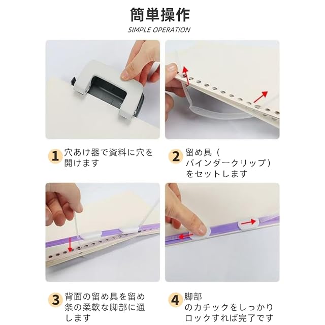 【工具不要!簡単操作】: 複雑な工具を必要とせず、誰でも手軽に使用可能。具体的には、①固定具を内側に押し込み②白色の副ロッドを外し③パンチで穴あけ④副ロッドを穿孔し主ロッドにセット⑤両側を押して固定する、という 4 ステップで簡単に文書を綴じることができます。外出先でもすぐに対応できるため、緊急時の文書整理にも最適です