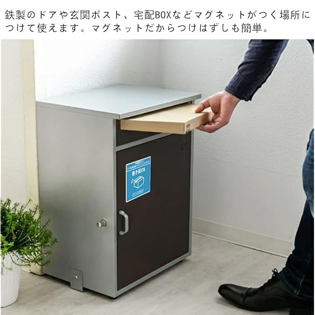 鉄製のドアや玄関ポスト、宅配BOXなどマグネットがつく場所につけて使えます。マグネットだからつけはずしも簡単。 耐候・耐水性に優れた材料を使用。雨に濡れても安心・安全、サッと拭くだけで汚れも落ちますので 特殊なアクリル板を使用していますので丈夫で長持ちするのが特徴です。