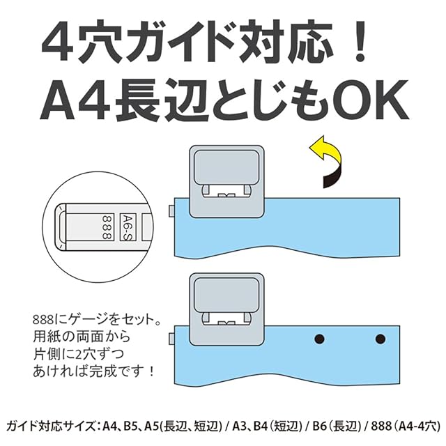 金属ゲージを888に合わせ、紙の両側から2回パンチすることで、4穴パンチとしても使用できる