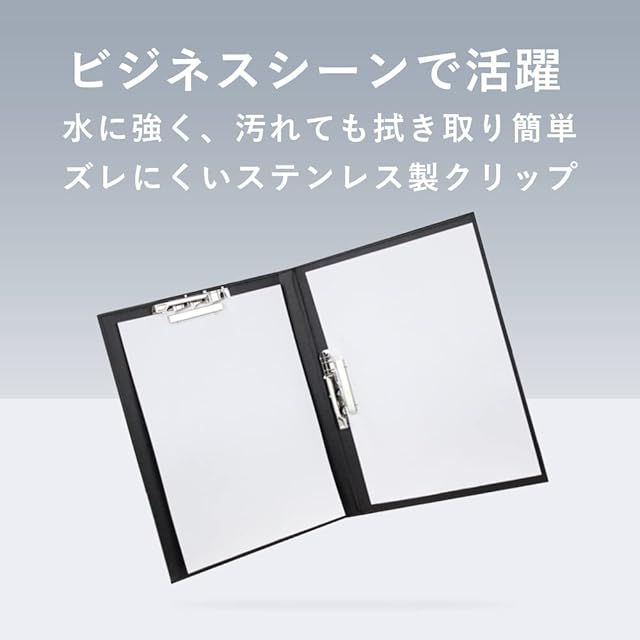 【書類の保管に】メモや資料の保存にお使い頂けるA4サイズのクリップボードです。ステンレスクリップで紙の落下を防止でき、二つ折りできるため収納した紙を綺麗に保つことができます。
