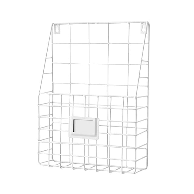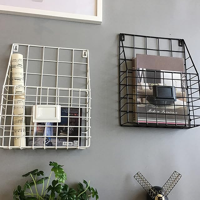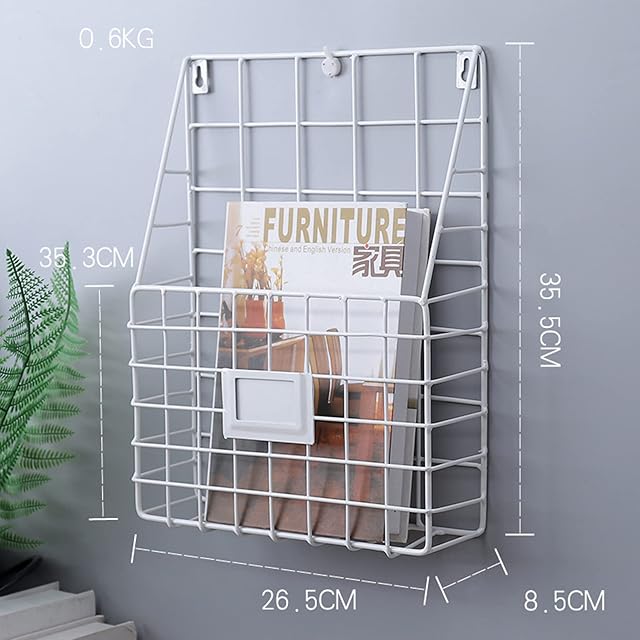 ブックスタンド メタルラック 壁掛け マガジンラック フック 雑誌書類収納 北欧風 ワイヤーバスケット デスクオーガナイザー 書類棚 リビングルーム マガジンバスケットラックホルダー 文具収納(ホワイト)