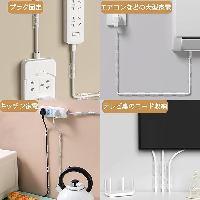 【広範囲接着面・超強粘着力】剥がれにくいコードクリップ!従来品より広い接着面積を採用し、コードの重さや振動にも耐える強固な固定力を実現。粘着シールはプラスチック/木目/金属など様々な素材に密着可能。浴室の湿度や冬場の結露が発生する環境でも剥がれにくい耐久設計で、大切な家電コードの落下防止に最適。