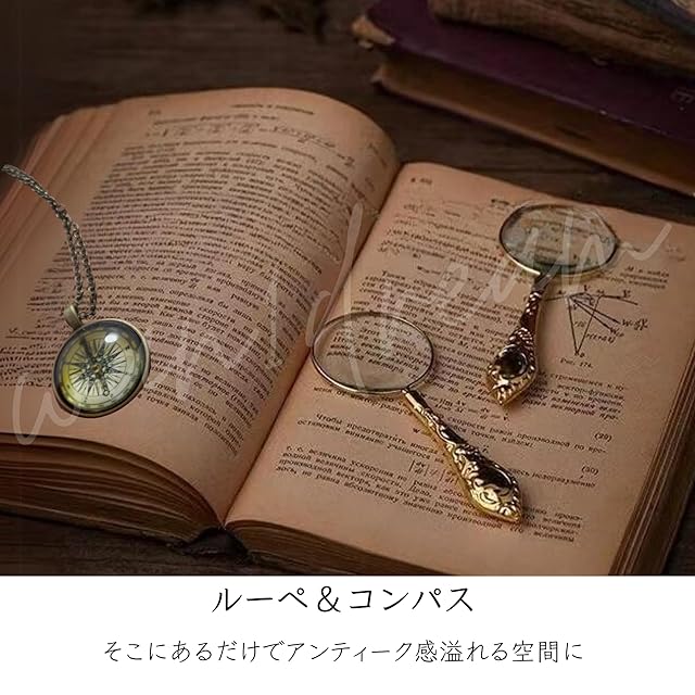 アンティーク風 インテリア小物セット ルーペ イミテーショングッズ 置物 ディスプレイ 雑貨 レトロ調 装飾 オブジェ コスプレ 撮影小物 雰囲気演出 (ルーペ&コンパス)