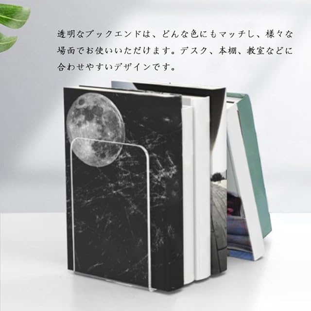 【多様なシーンで活躍】透明なブックエンドは、どんな色にもマッチし、様々な場面でお使いいただけます。デスク、本棚、教室などに合わせやすいデザインです。