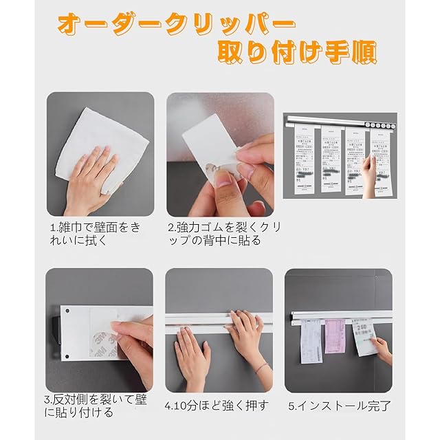 【穴あけ不要&取り付け簡単】伝票ホルダー 壁掛けは強力な両面テープが付いていますので、穴あけ不要で簡単に壁に取り付けできます。セラミックタイル、大理石、金属、ガラス、無垢材、その他の平らで乾燥した、ほこり、水の汚れ、油汚れのない表面に適しています。新モデルはプラグフリー設計を採用し、様々なサイズを自由に接続でき、紙がスムーズに移動も可能。