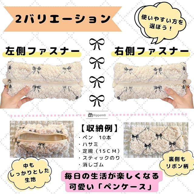 Rippem8 ペンケース もこもこ モコモコ 筆箱 ぬいぐるみ リボン柄 ふわふわ 大容量 小物入れ ポーチ 【右側ファスナー】