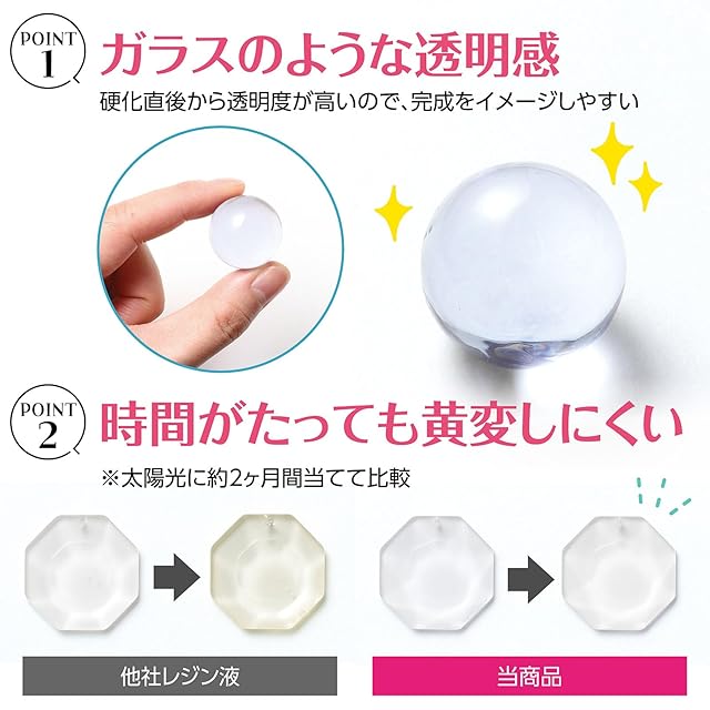 特徴1:ガラスのような透明感で時間がたっても黄変しにくいです。透明度が高いのでドライフラワーなどを封入しても綺麗です。特徴2:気泡が抜けやすい!低粘度タイプなので少量の気泡ができても時間を置くことで自然に気泡が抜けます。初心者でも作品がきれいに仕上がる!